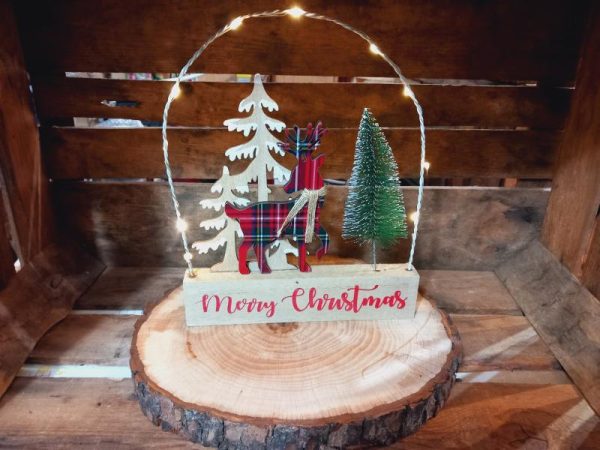 Decorazione in legno e ferro con luci e renna scozzese