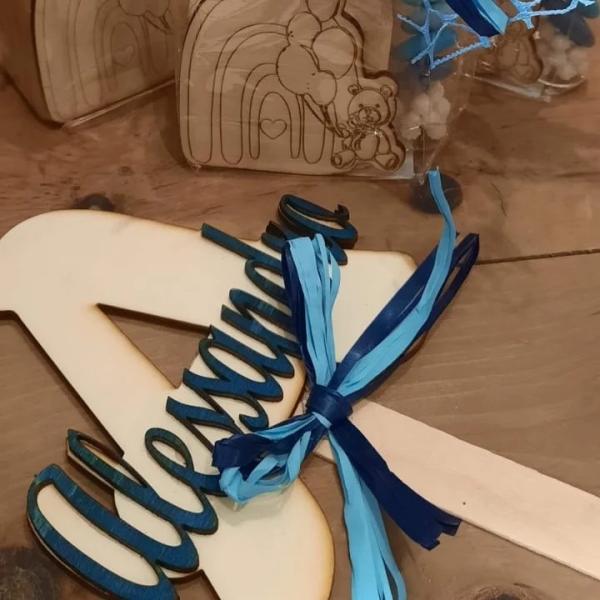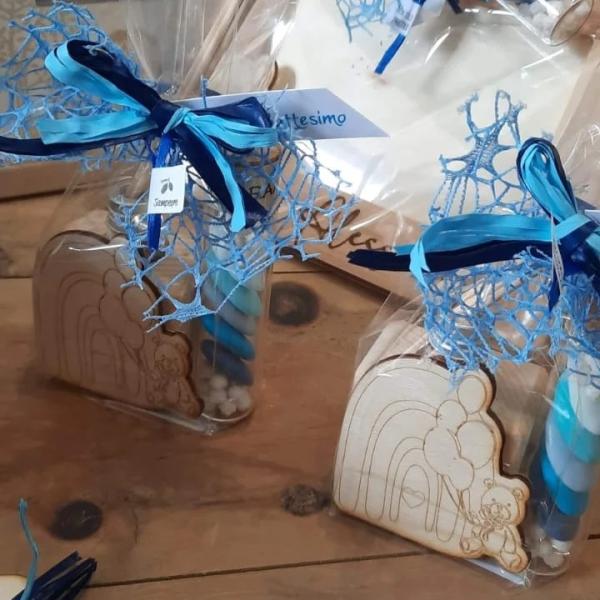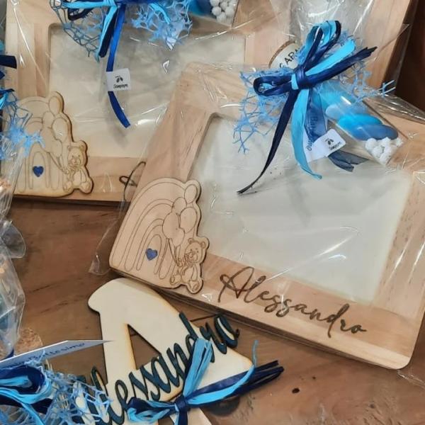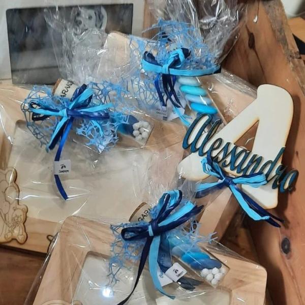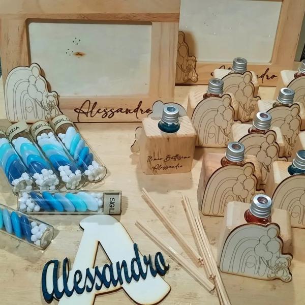 Realizzazione artigianale di bomboniere di battesimo personalizzate per il piccolo Alessandro. Sono disponibili piccoli profumatori artigianali con un tema personalizzato sui toni del blu, completi di cake topper e portafoto in legno.