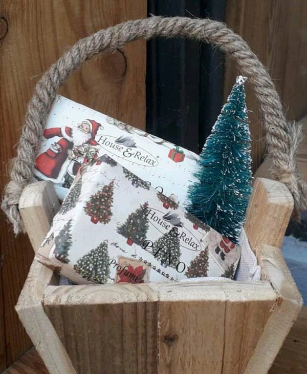 Set di due saponette artigianali a base vegetale con cestino in legno vecchio personalizzabile.