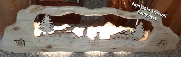 Lampada da muro realizzata in Abete. composta da 2 strati: il paesaggio tagliato a laser in abete da 2 cm e la cornice in abete grezzo e inserti di stelle alpine.