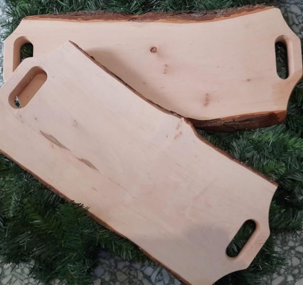 Tagliere in legno di ontano rustico, con bordi svasati, corteccia naturale e manici da entrambi i lati per una presa facile e sicura.